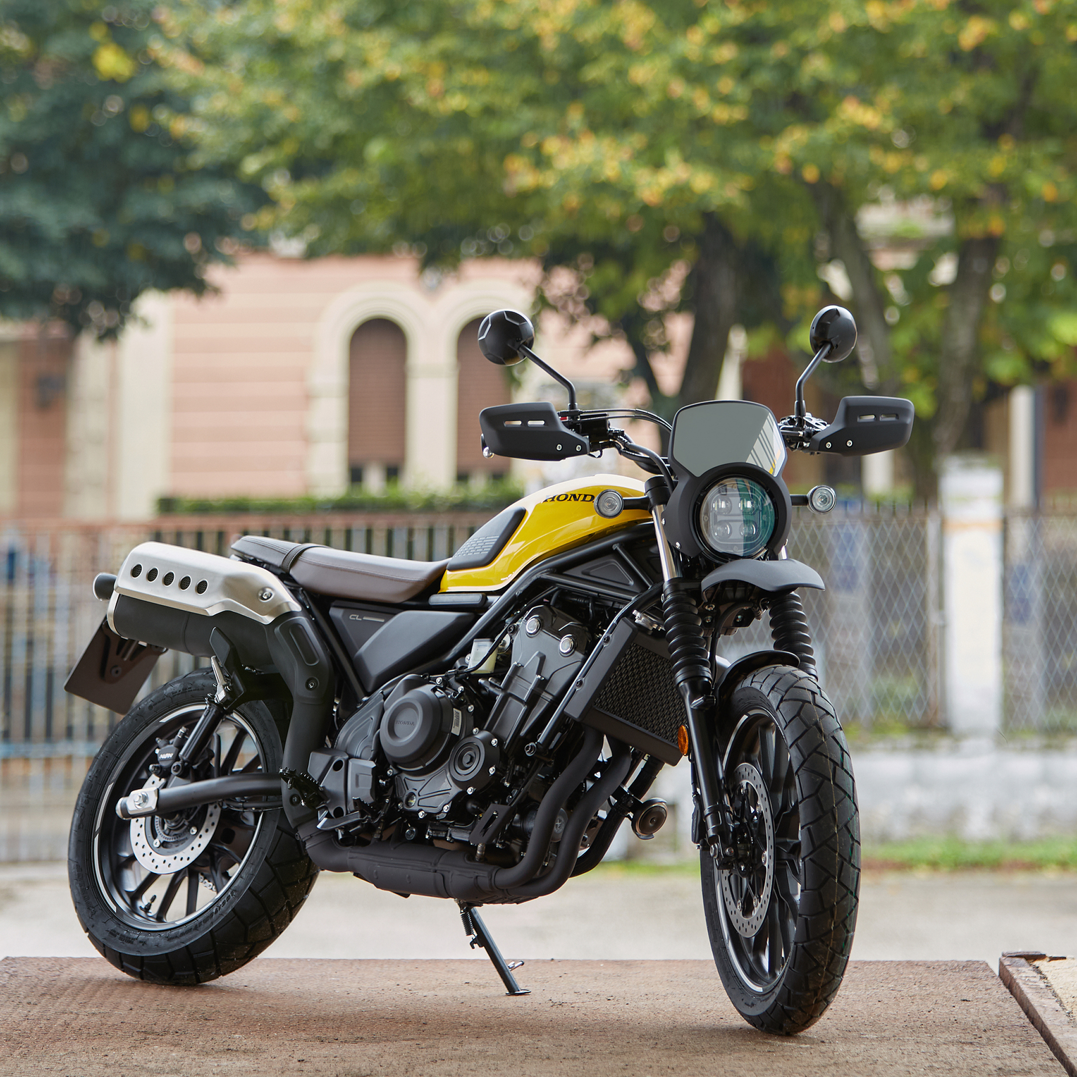 Cliché de face de la Honda CL500 pris en studio.